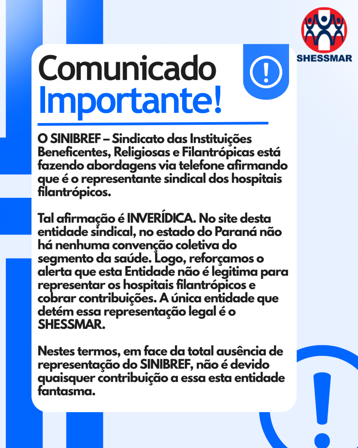O SINIBREF – Sindicato das Instituições Beneficentes, Religiosas e Filantrópicas está fazendo abordagens via telefone afirmando que é o representante sindical dos hospitais filantrópicos. Tal afirmação é INVERÍDICA. No site desta entidade sindical, no estado do Paraná não há nenhuma convenção coletiva do segmento da saúde. Logo, reforçamos o alerta que esta Entidade não é legitima para representar os hospitais filantrópicos e cobrar contribuições. A única entidade que detém essa representação legal é o SHESSMAR. Nestes termos em face da total ausência de representação do SINIBREF, não é devido quaisquer contribuição a essa esta entidade fantasma.